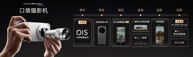 创作自由不只属于静态影像,为此vivo X300 Ultra视频能力再度升级。不仅全焦段视频高规格,而且全焦段视频好画质。防抖方面,全焦段OIS光学视频防抖,其长焦3°OIS光学防抖能力,即使装上增距镜拍摄,依然稳定出片。收音方面,四麦收音大师,支持6大场景化收音预设,一键获得高质量的收音,还可以连接专业的无线麦,实现收音自由。在监看上,2K蔡司大师色彩屏作为取景器,全场景取景和监看时色彩更真实;参考专业电影摄影机全新推出的专业录像模式Pro,参数布局清晰,调节更便利,一键清屏功能只需轻点屏幕,便可沉浸式构图;开放的自定义3D Lut导入监看功能,让用户可以将常用的调色LUT直接加载进取景器,拍摄时就能预览最终的电影色调。在回放上,全新升级的大师双扬,上扬净腔体积提升至270%,堪比电影级声场。最后也是最重要的一步,在后期方面,全焦段4K 120fps 10bit Log,422采样,APV帧内编码,完整将色彩和影调的决定权交给后期;同时vivo Log已适配ACES专业后期流程,让Log素材能与专业电影摄影机素材在同个色彩空间协同调色,无缝对接影视制作体系。此外,还可直接在相册中预览、烧录3D Lut,vivo摄影App还内置3D Lut库,定期更新风格化预设,让用户轻松获得独特的调色风格。V单真正打通了从拍摄到后期、完整可控的专业视频创作工作流,当用户在观看演唱会或体育赛事时,抬手就能拍出转播级画面。
