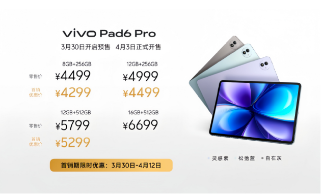 跟随vivo X300 Ultra、vivo X300s一同发布的还有vivo Pad6 Pro,以全面进化的旗舰实力推动安卓正式开启4K性能平板时代。搭载13.2英寸4K原彩屏,支持杜比视界,视听体验更沉浸;配合第五代骁龙8至尊版,实现性能跨越式升级;集成PC级WPS和剪映专业版,学习办公与创作表达高效合一。提供松弛蓝、灵感紫、自在灰三款配色,上市价格4499元起。目前已经开启预售,4月3日正式开售,首销期间可享多重优惠。