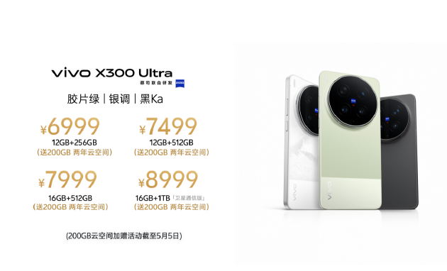 vivo X300 Ultra与vivo X300s两款新品价格在此次发布会上公布,并于4月3日正式开售。其中vivo X300 Ultra拥有12GB+256GB、12GB+512GB、16GB+512GB、16GB+1TB(卫星通信版)和16GB+1TB摄影师套装(卫星通信版)五个版本,售价分别为6999元、7499元、7999元、8999元和11999元。