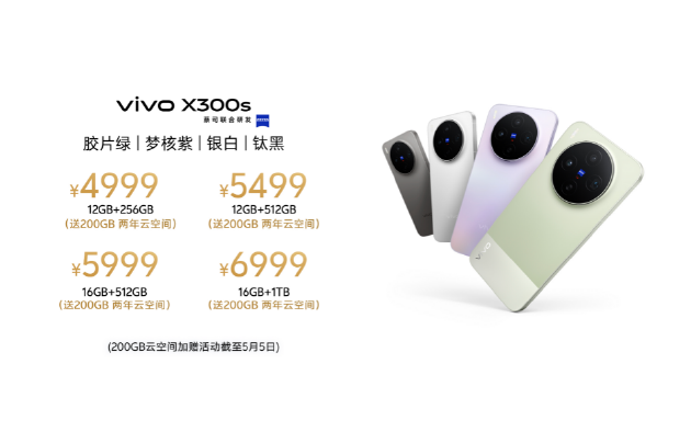 vivo X300s拥有12GB+256GB、12GB+512GB、16GB+512GB、16GB+1TB四个版本,售价分别为4999元、5499元、5999元和6999元。